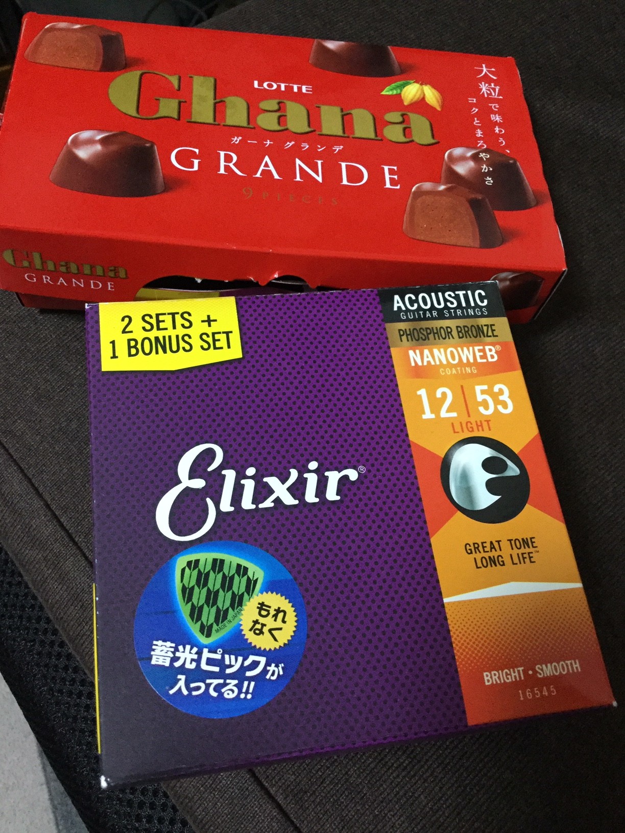 魚を食べて、チョコと野菜を食べながら エリクサーの弦を貼ろうと思います♪