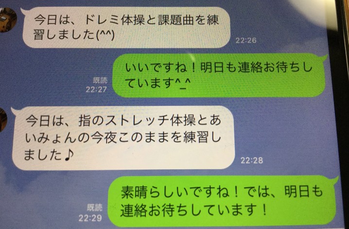 ラインで練習日記を毎日つけて頂いて、僕に送ってもらっています。