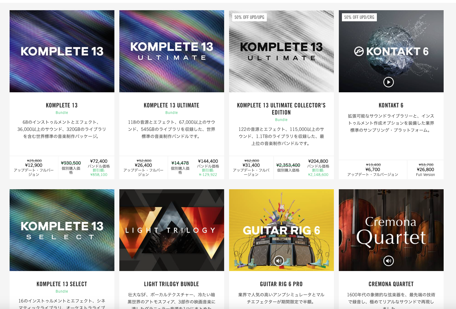 夏のサマーセールでは、KOMPLETE 13などのパッケージ版やパッケージ以外の単体ソフトがアップグレード半額