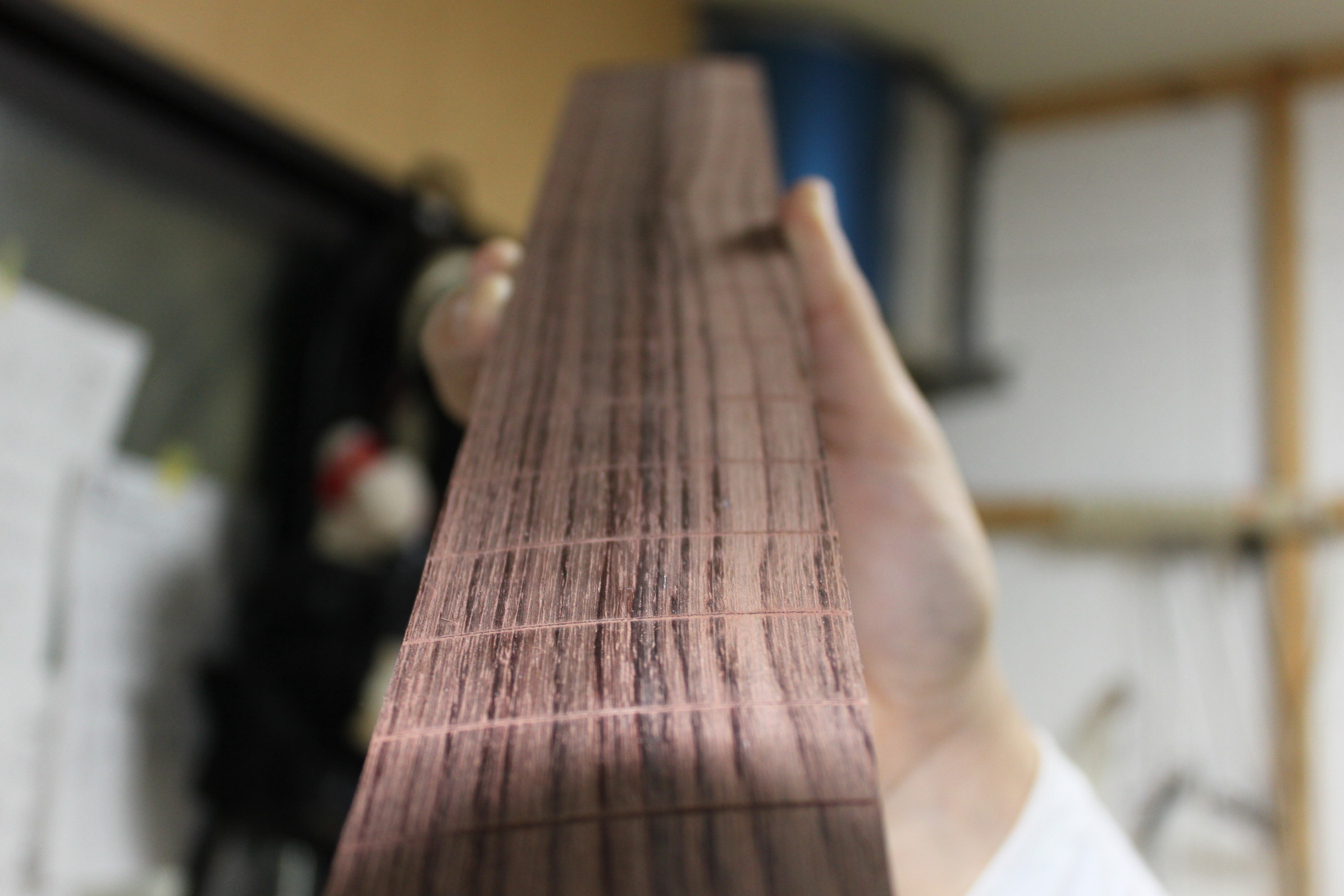 機械で削ったばかりのネックを見せてもらいました。まだ フレットも打ち込んでいないので