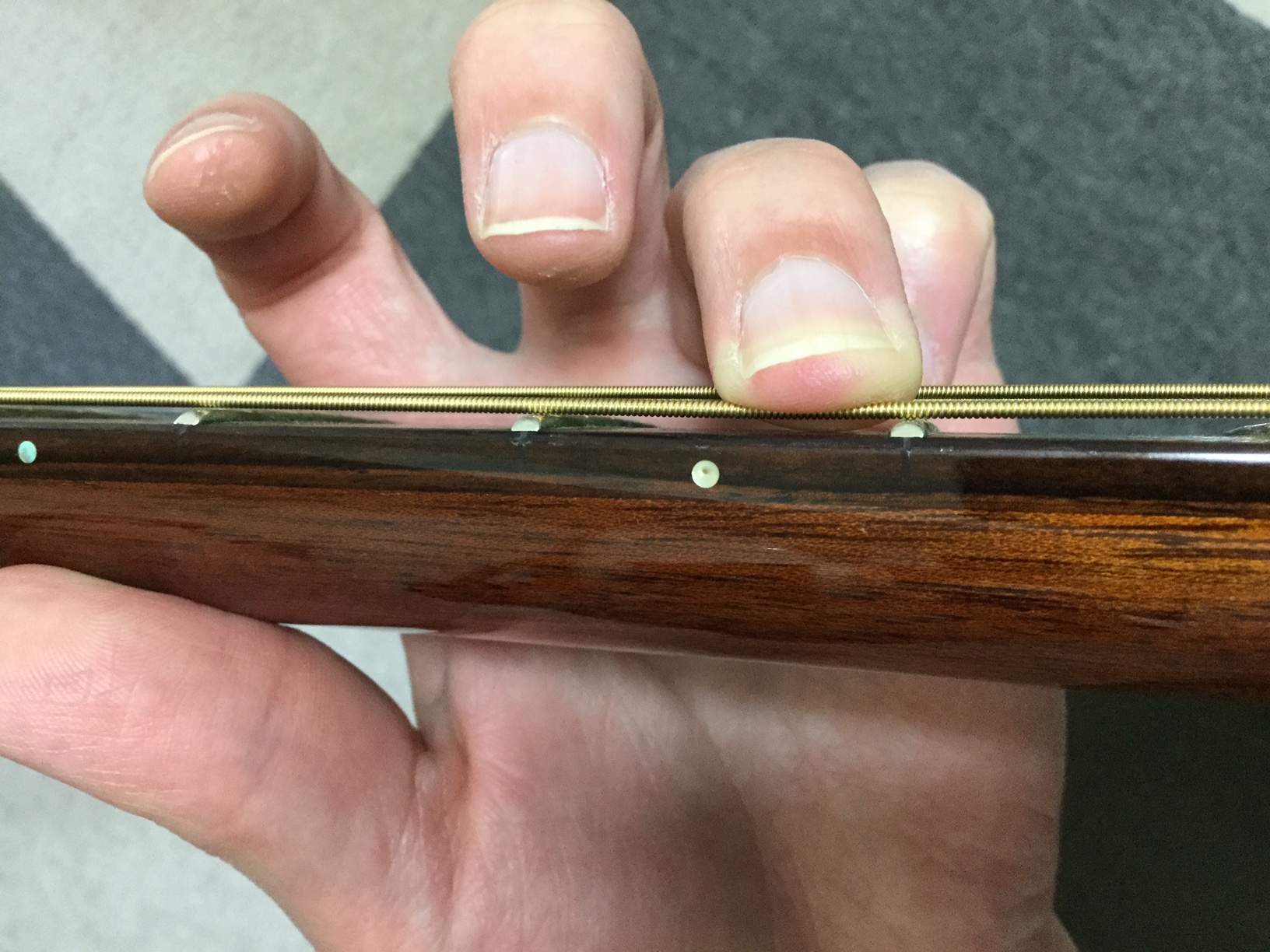 弦に指が触れてはいるけど、、、弦がフレットとは密着していない状態です。