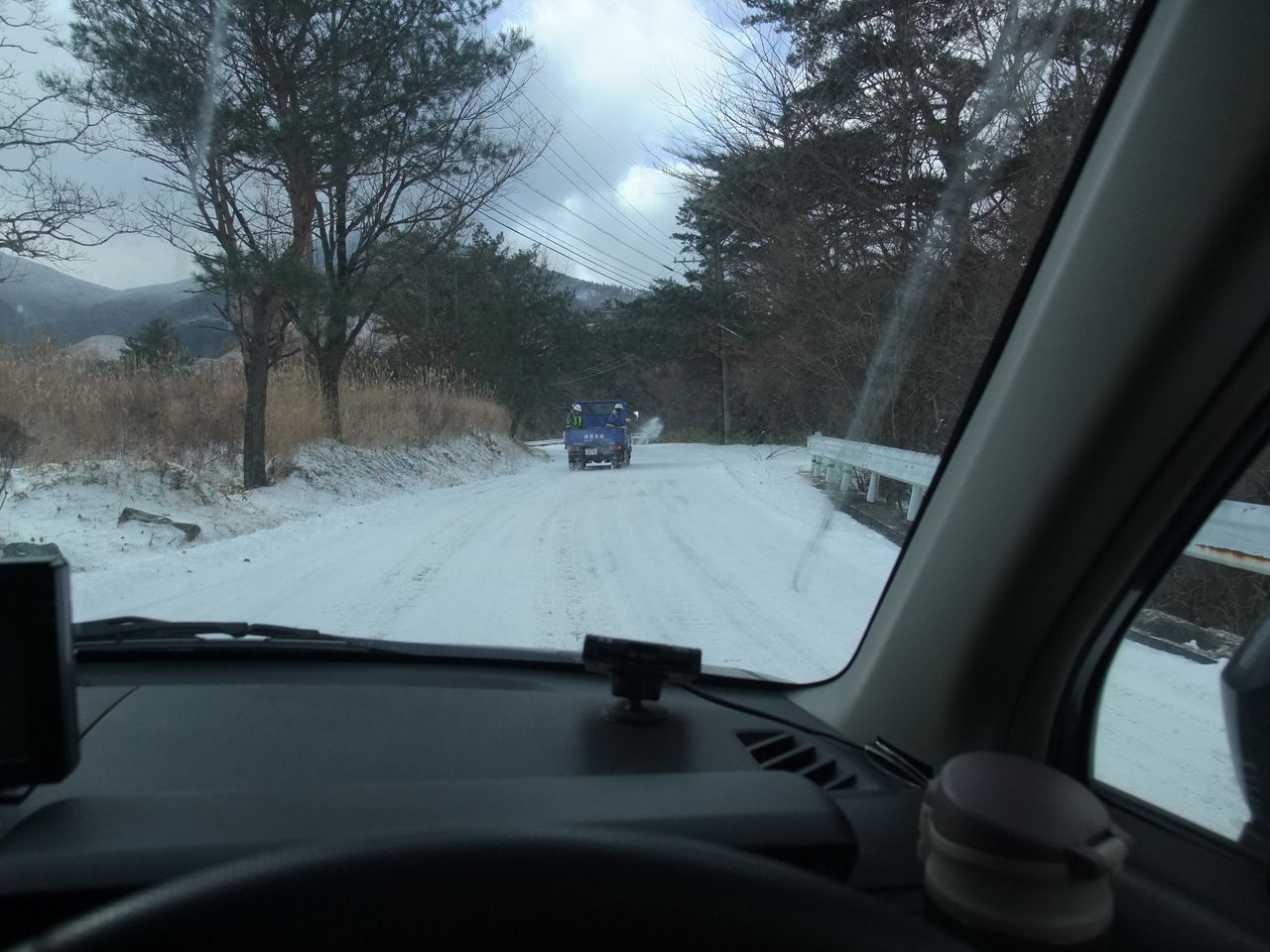 道路はカチコチで 雪もこんなで チェーンを装着しないと大変な事になります。