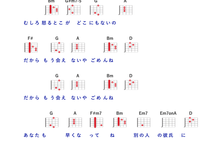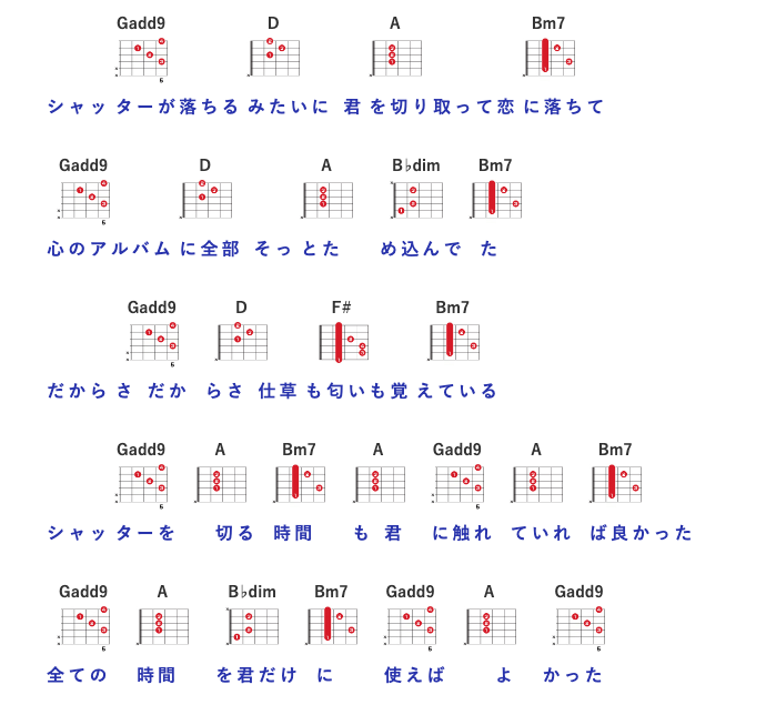 コードは、キーがDになるのでシャッターよりは少しセーハが多いコードが増えてきます。