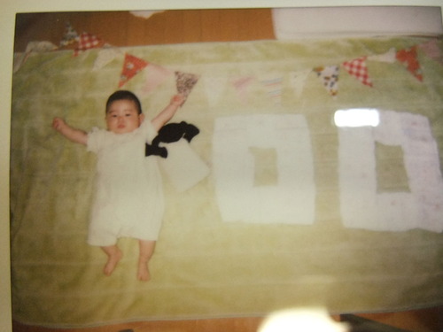100日祝いの100日ポーズ。1が娘で0と0がオムツ(-。-:)