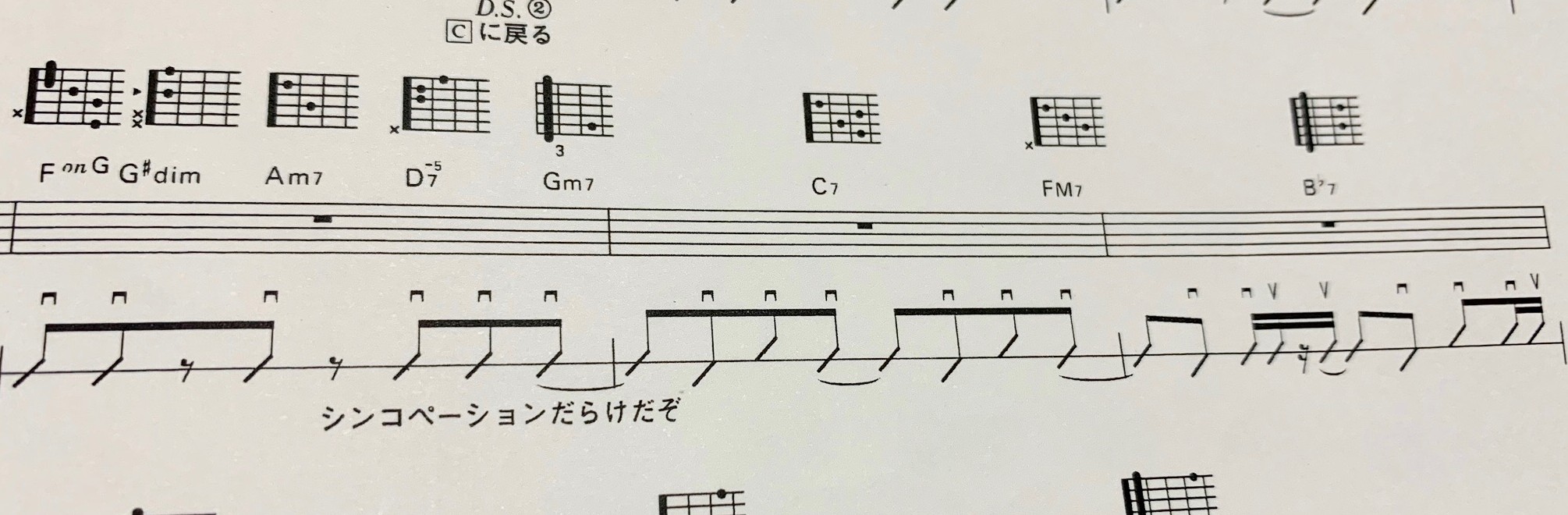 と表記してあるほどのコードチェンジと裏拍のリズムだらけです。