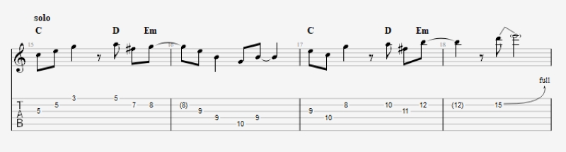 コードトーンを使いソロっぽく弾くとこのようになります。