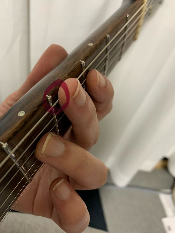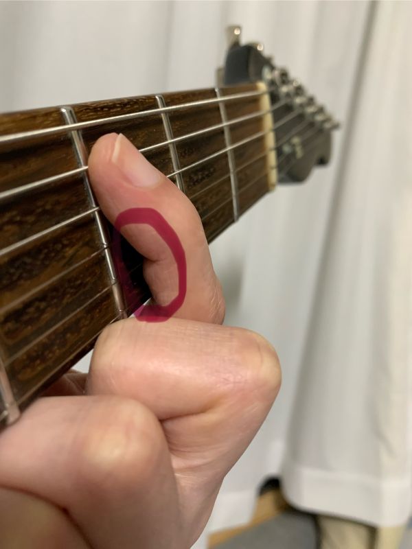 人差し指も赤丸の腹のほうで2,3弦をミュートします。