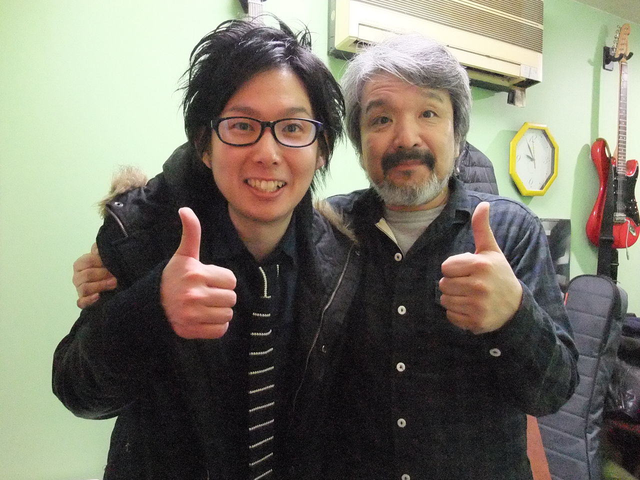 (白い稲葉さんのストラトのギターを弾く大分中村ギター)