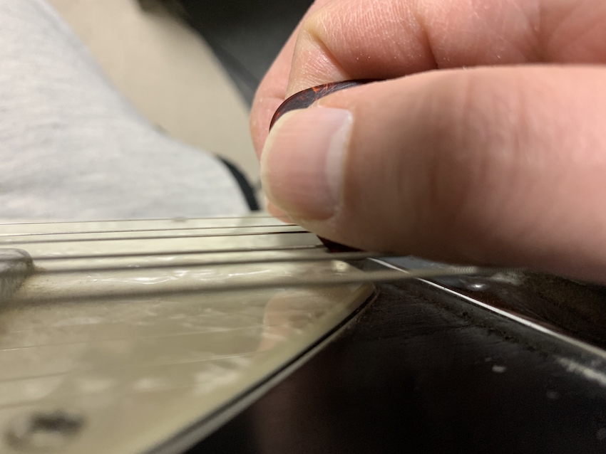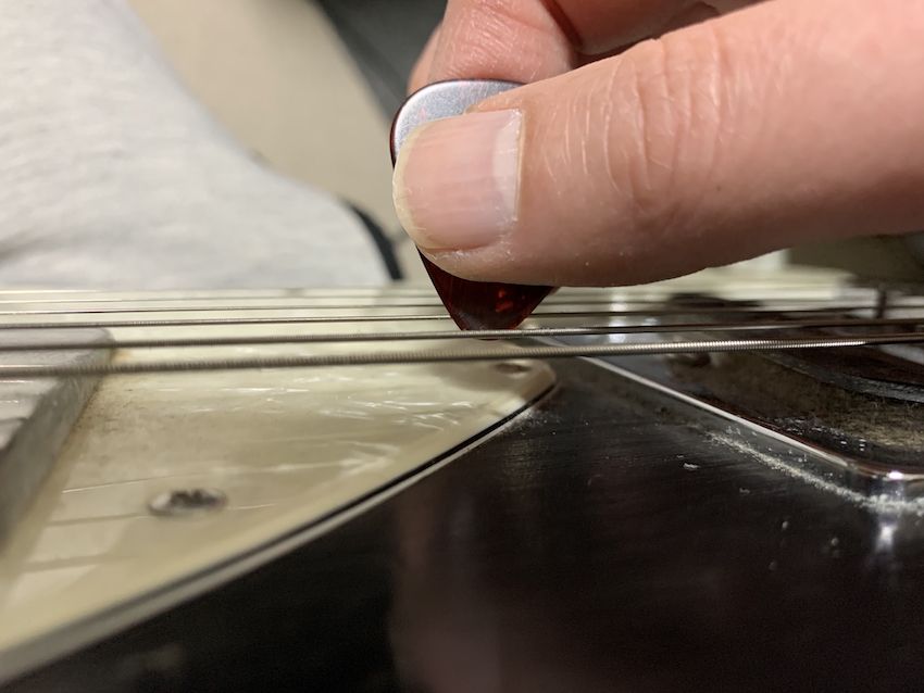 ピックが弦に当たる深さは2〜3mmほどというところでしょうか。