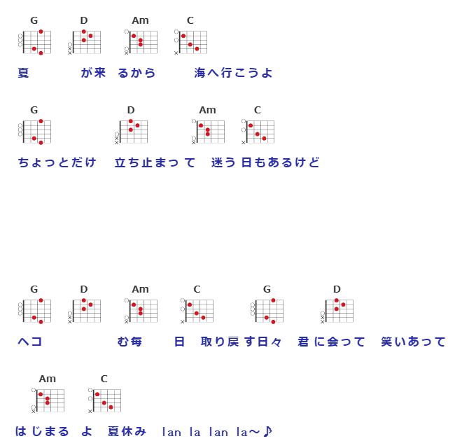 コードストロークで使用されているコードが1カポでG,D,C,Amになります。
