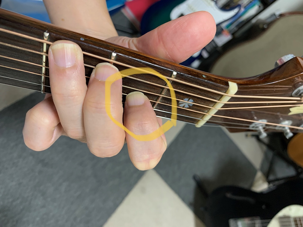 人差し指で強く下に引っ掻いて3弦を弾きます。