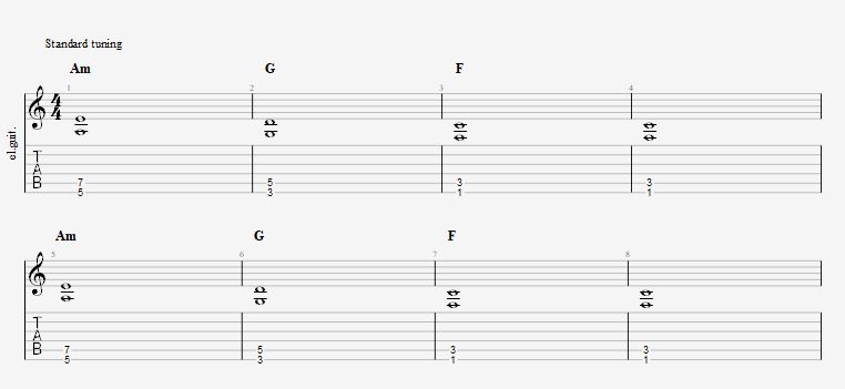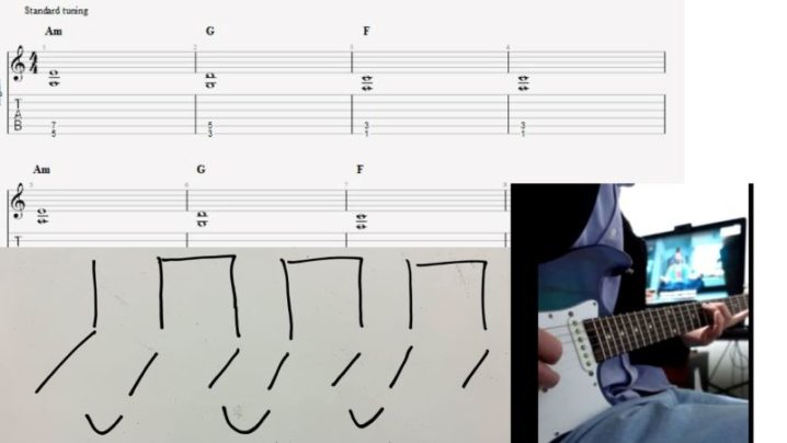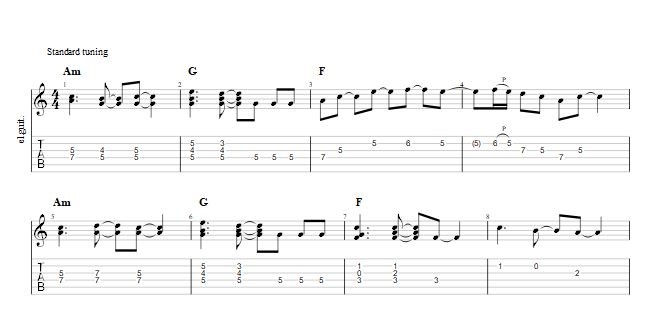Fのパワーコードでは、Amペンタトニックスケールを使いながら