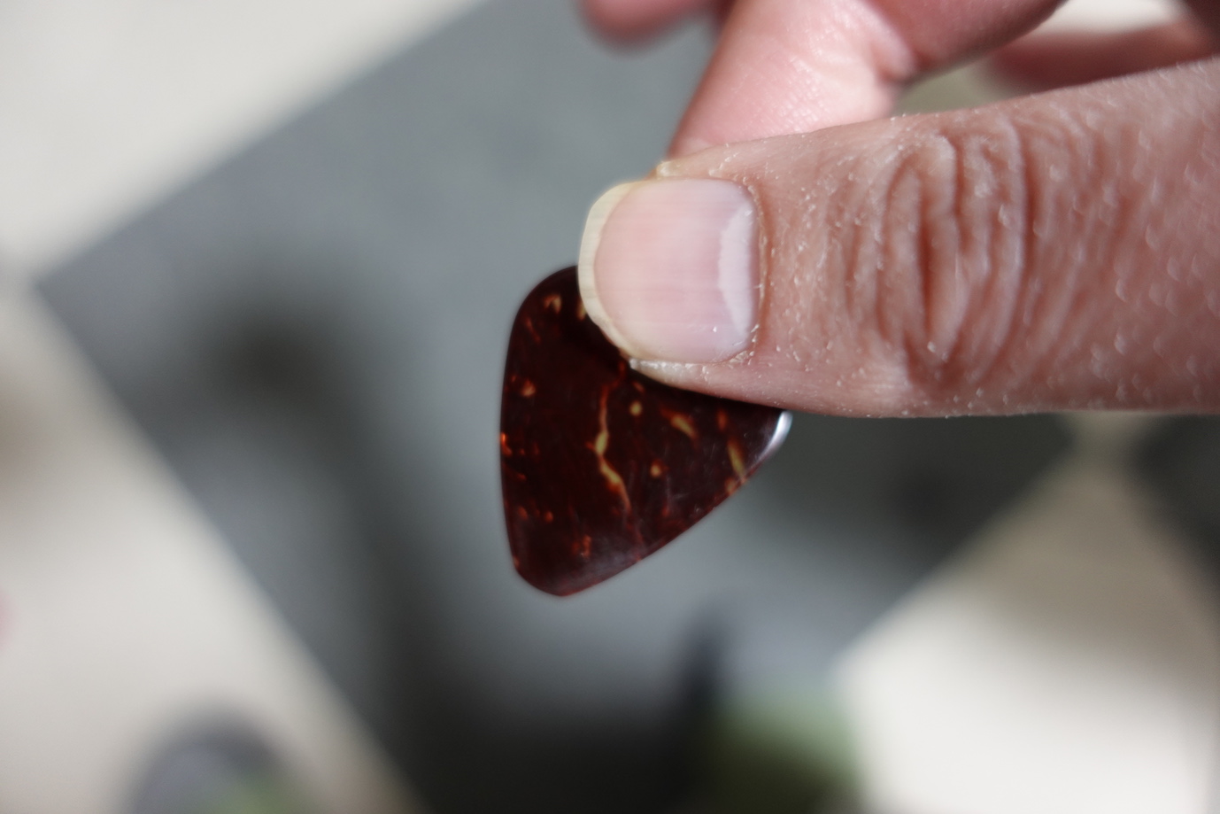 ピックを持つ指が広い面積に触れることができると良い感じの音になりますが