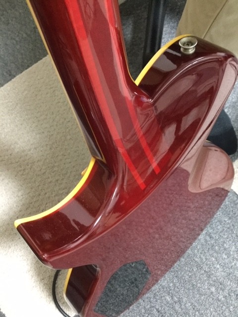 ボディーの裏のジョイント部分がこんな感じに加工されていて、ハイポジションも弾きやすそうです!