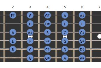 ②のフレーズは3度の音に向かって弾き少しクロマチックスケールで