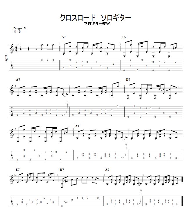 チューニングは6弦のみDに音程を下げて弾くtab譜です。