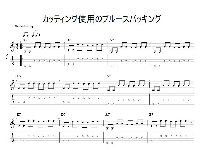 AのBluesの伴奏で使用できるカッティング使用の譜面です。