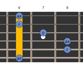 親指で6弦の1フレットを押さえながら