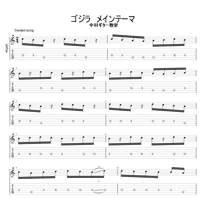 ゴジラ登場部分のイントロメロディーもギターで弾けるようにTAB譜にしましたが