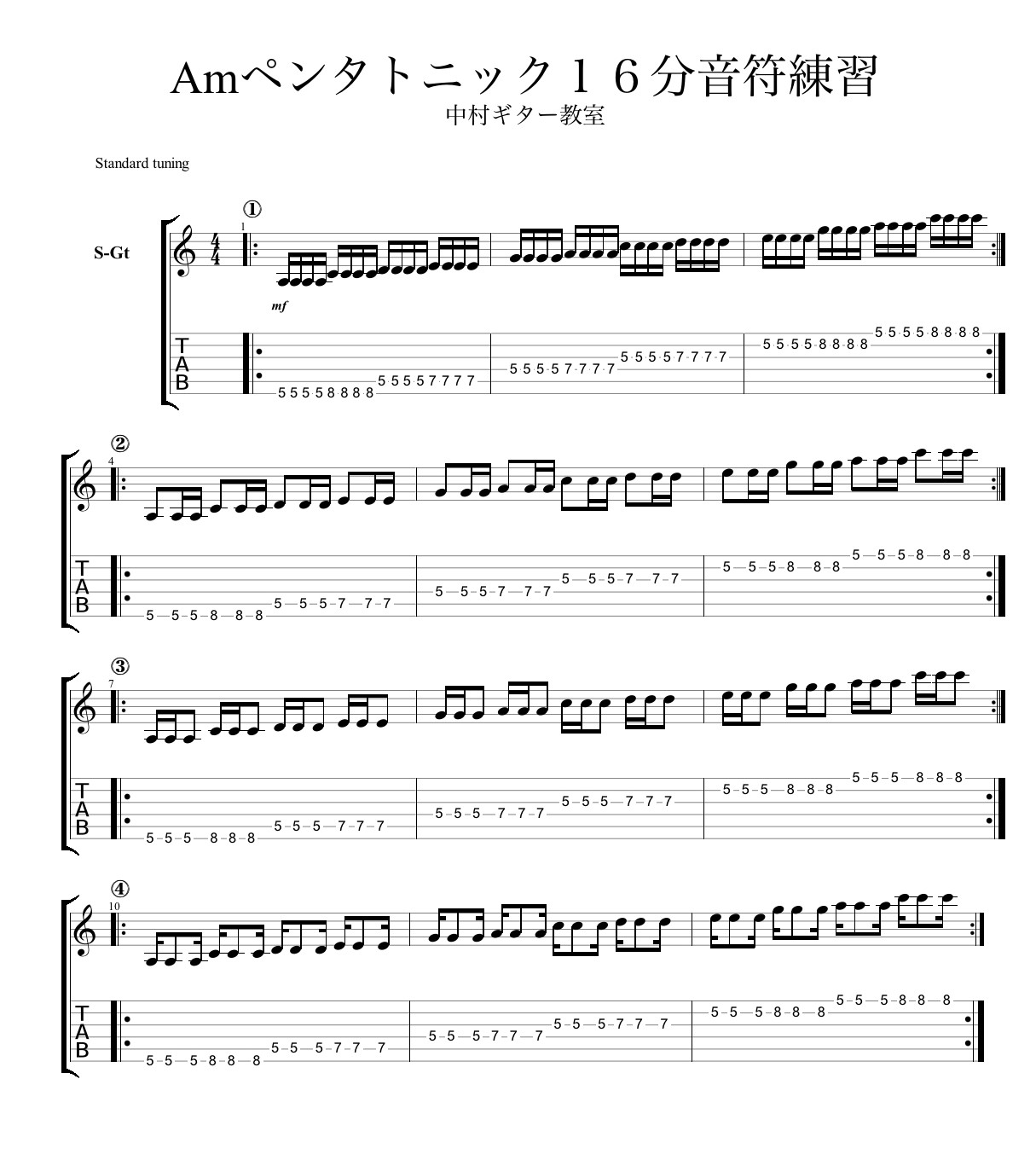 ①まずは、16分音符でAmペンタトニックスケールを6弦から順番に