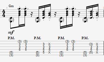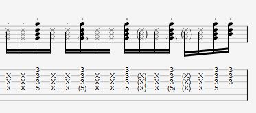 最初の小節からいきなりブリッジミュートで16分音符の裏を