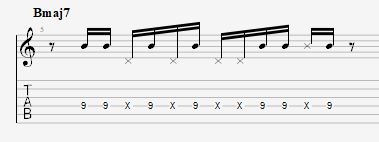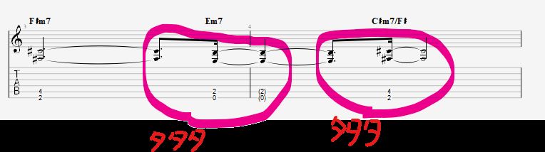 16分音符3つ「タタタ」と数え そのあとにパワーコードを弾いていきます。