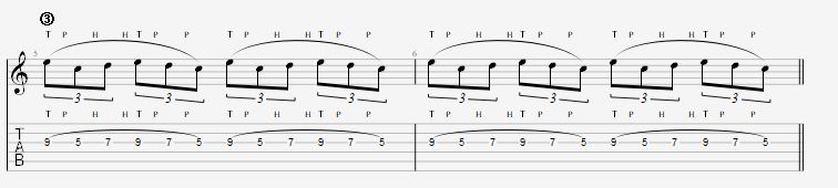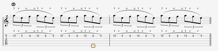 フレーズ1同様ハンマリングとプリングを繰り返しますが、