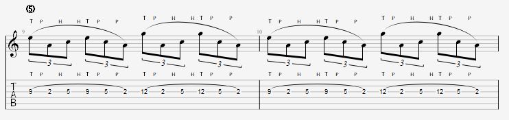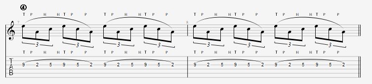 ライトハンド奏法フレーズの醍醐味である音程差を使ったフレーズです、