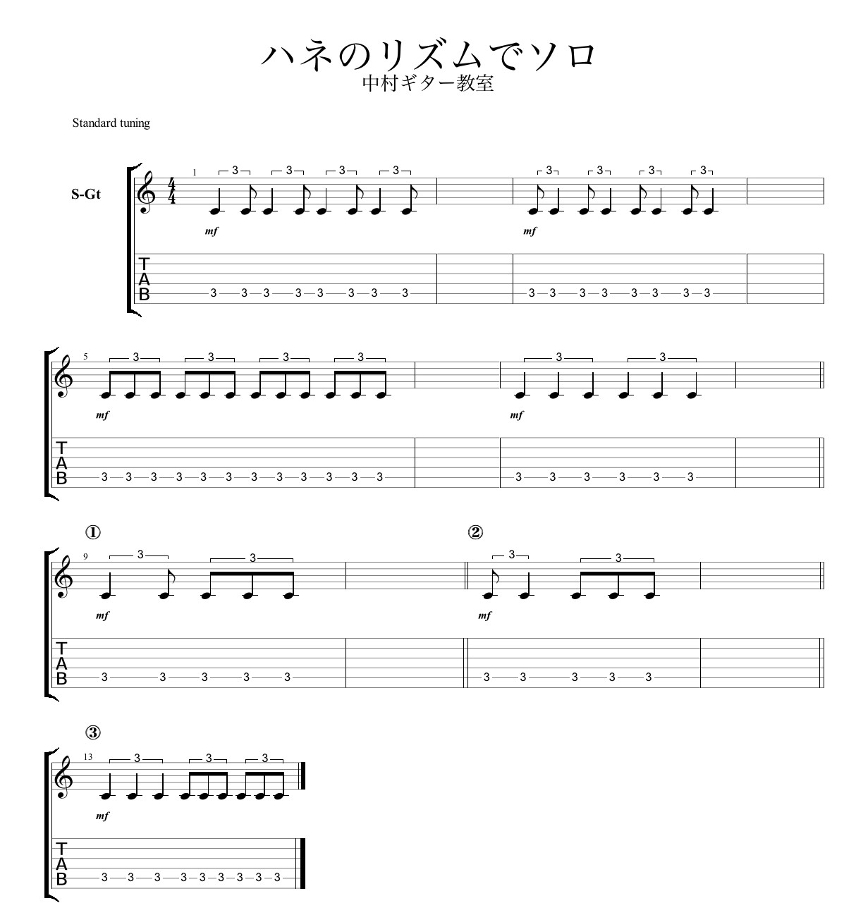 跳ねリズムの基本的なものは、TAB譜に記載されているものでほとんどになります。