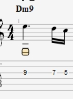 Dm7のコードトーンである9thのE音から弾き始めています。