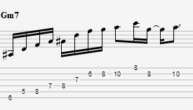 またGm7の小節では、代理コードになるB♭M7を選択してフレーズを作ってみました。
