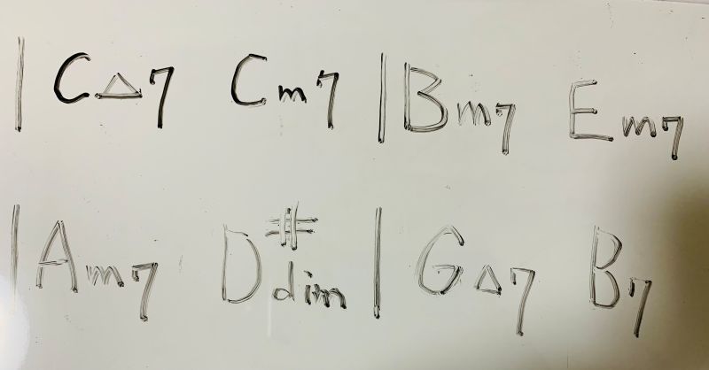 Cm7のところで気をつけてコードトーンやCドリアンスケールなどを